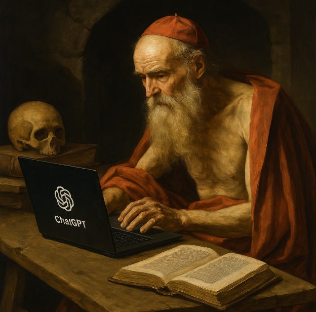 Even St. Jerome might be tempted by a laptop with ChatGPT (created by ChatGPT 4o - one shot)